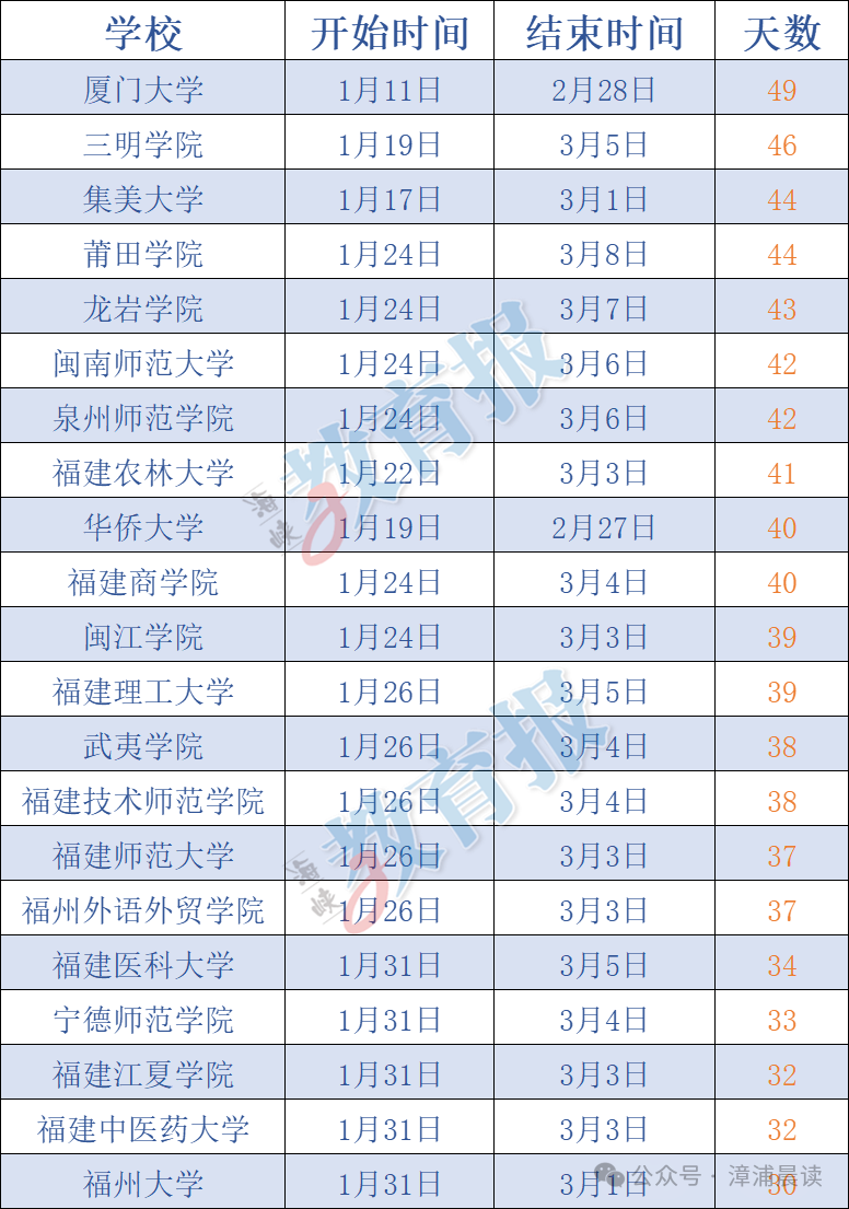 从放假结束的时间来看,大部分集中在3月初,也有部分高校于2月下旬就返校,如:厦门大学、华侨大学。