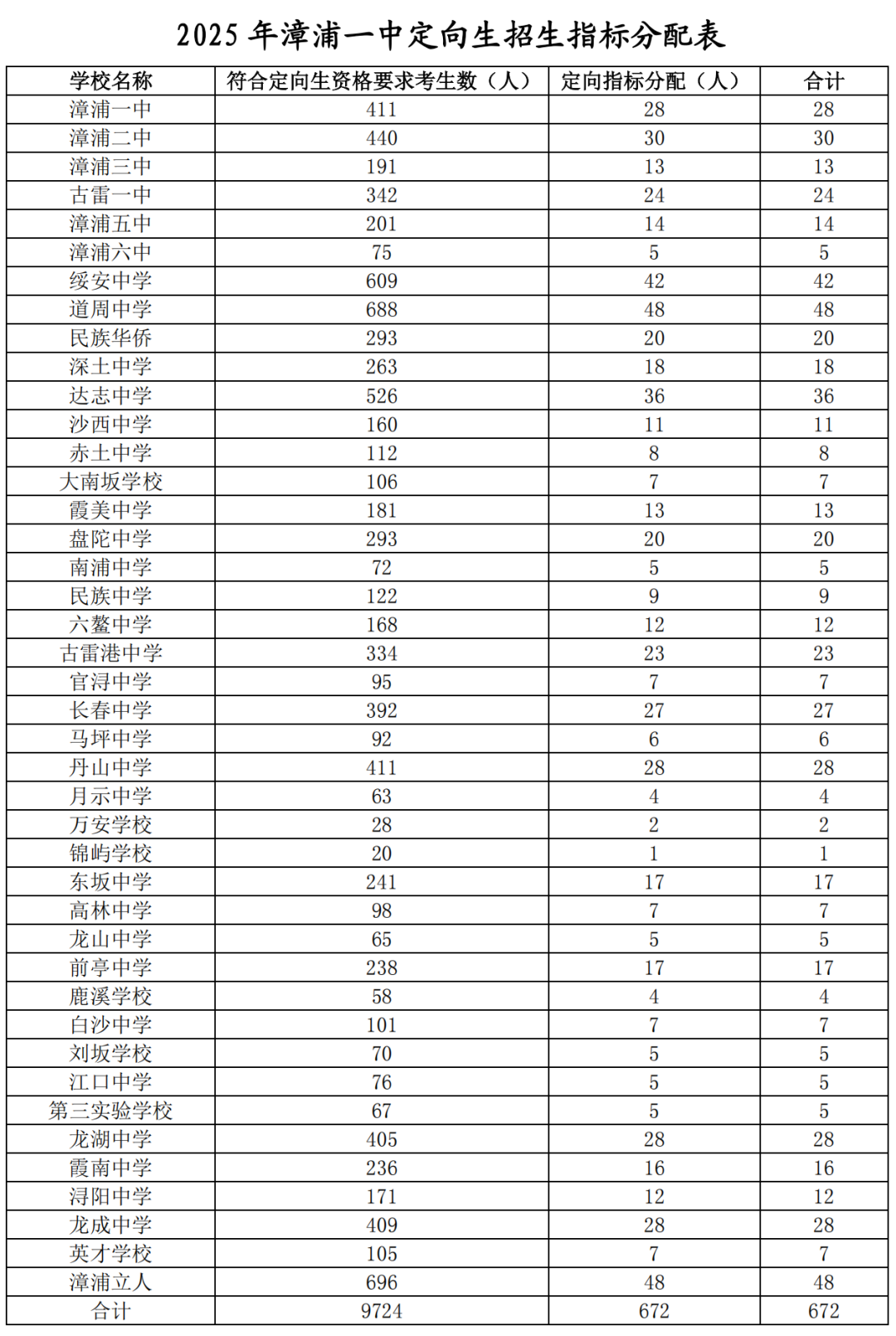 3.2025年漳州市优质普通高中学校定向生招生指标分配表