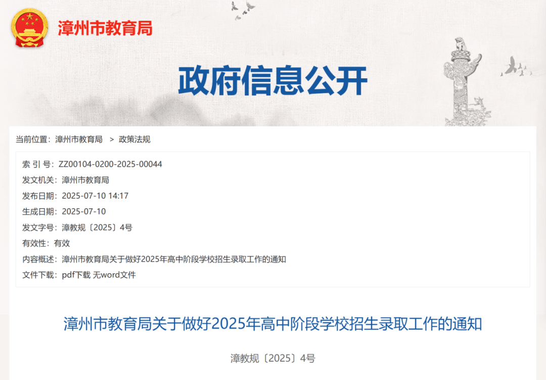 根据福建省教育厅印发的《福建省高中阶段学校考试招生制度实施意见》(闽教基〔2018〕66号)、《福建省教育厅关于全面落实中考中招改革进一步强化考试招生评价育人导向的通知》(闽教基〔2021〕6号)、《福建省教育厅关于做好2025年中职本科“3+4”贯通培养试点工作的通知》(闽教职成〔2025〕11号)等,以及福建省教育厅高中招生工作有关精神,为全面落实中考中招改革,强化考试招生评价育人导向,实施公民办学校同步招生,促进教育公平,现就做好2025年漳州市高中阶段学校(含普通高中、中职本科“3+4”、五年制高职院校、中职学校、技工院校,下同)招生录取工作具体事项通知如下。