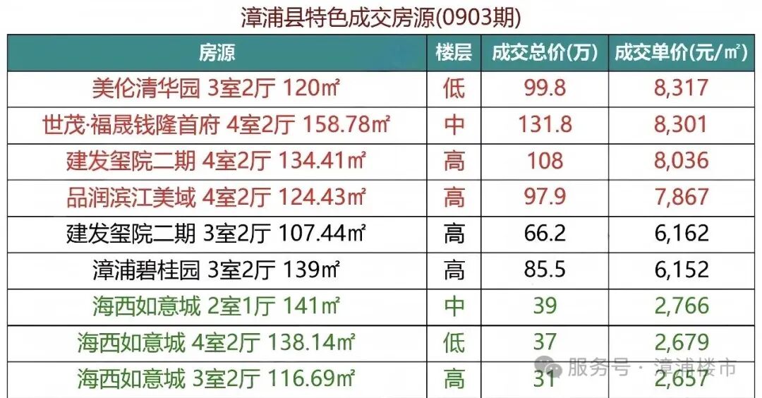 漳浦县成交单价最高:美伦清华园 3室2厅 120㎡,低,单价8,317元/㎡,总价99.8万;