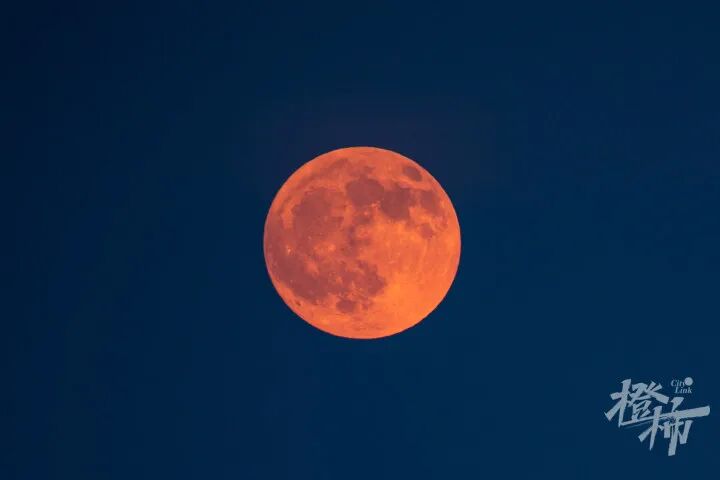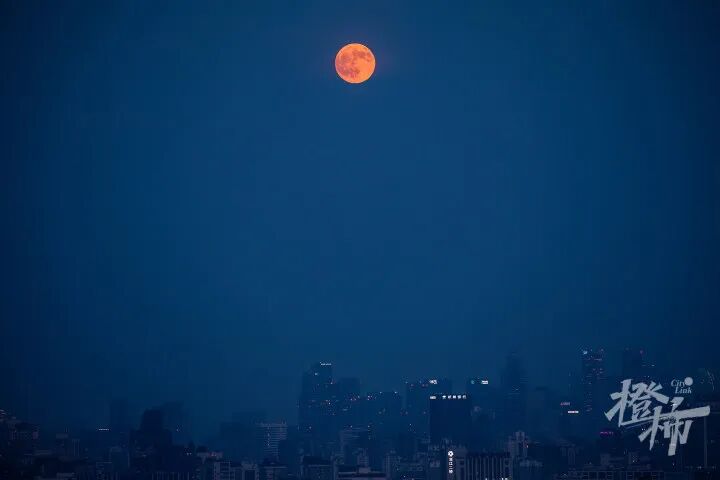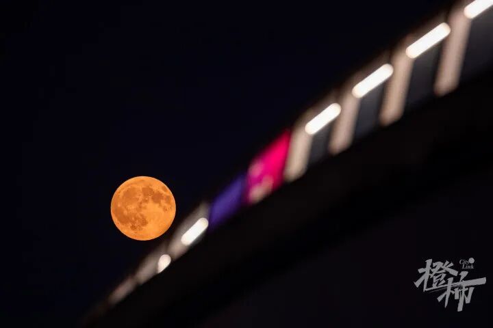 今晚6点30分,一轮满月从杭城东边升起,由于大气散射效应呈现红色。 橙柿互动·都市快报记者 陈中秋 摄