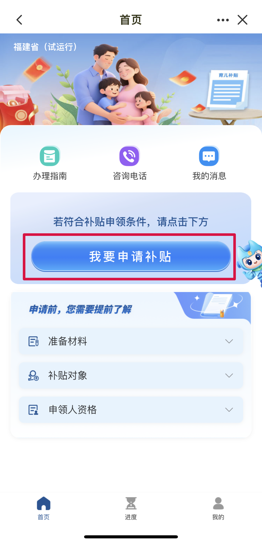 进入闽政通APP,点击首页"育儿补贴申领“头图、热门服务版块“育儿补贴”或腰部banner图。